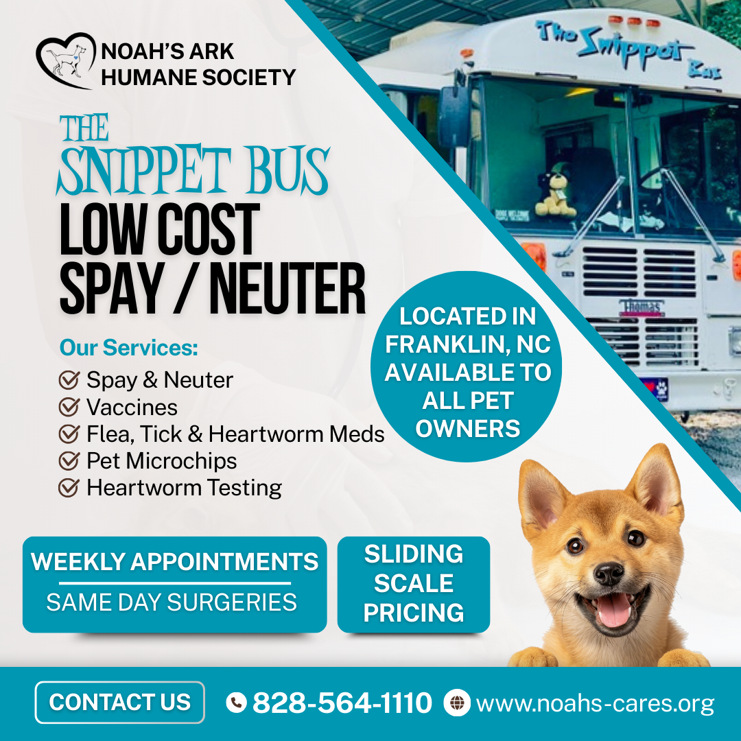 Noah's Ark Humane Society has partnered with Appalachian Animal Rescue to provide affordable spay and neuter services for cats and dogs in Western North Carolina. All surgeries are performed on the Snippet Bus, a fully equipped mobile surgical suite that remains parked at the Appalachian Animal Rescue Center in Macon County. Pricing is based on a sliding scale according to income, making these essential services accessible to all pet owners. In addition to spay and neuter, we offer vaccines, microchips, dewormer, and flea, tick, and heartworm preventatives. Appointments are available every Tuesday and Thursday, with pets dropped off in the morning and picked up the same afternoon.